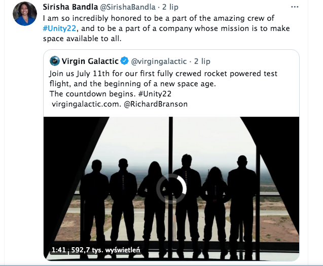 Gratulując Shirishy Bandli sukcesu, wice prezydent Indii, Venkaiah Naidu, wyraził na Twitterze nadzieję, że jej osiągnięcie zmotywuje o wiele więcej młodych dziewcząt w Indiach i za granicą do podjęcia ambitnej kariery. Nieco obłudne stwierdzenie w ustach polityka BJP – partii, która hołduje tradycyjnie postrzeganej roli społecznej kobiet. Niemniej, trudno odmówić mu słuszności: oby Shirisha Bandla pociągnęła za sobą kolejne indyjskie dziewczęta, których marzenia przebijają szklany sufit.