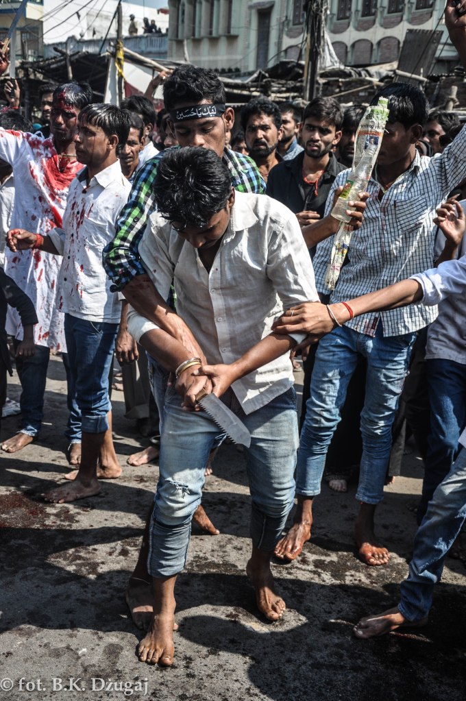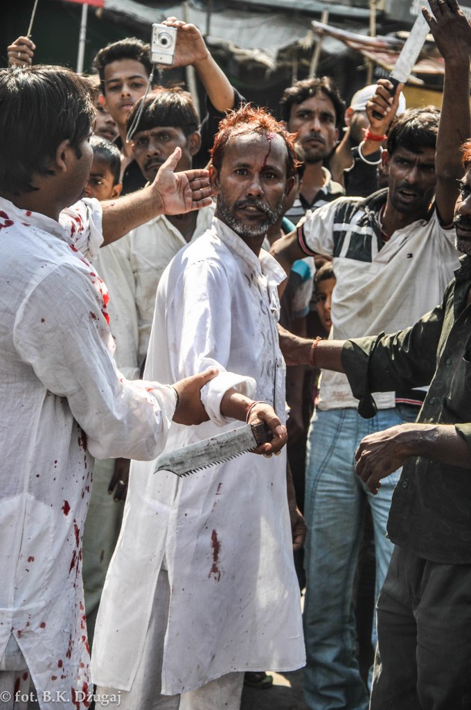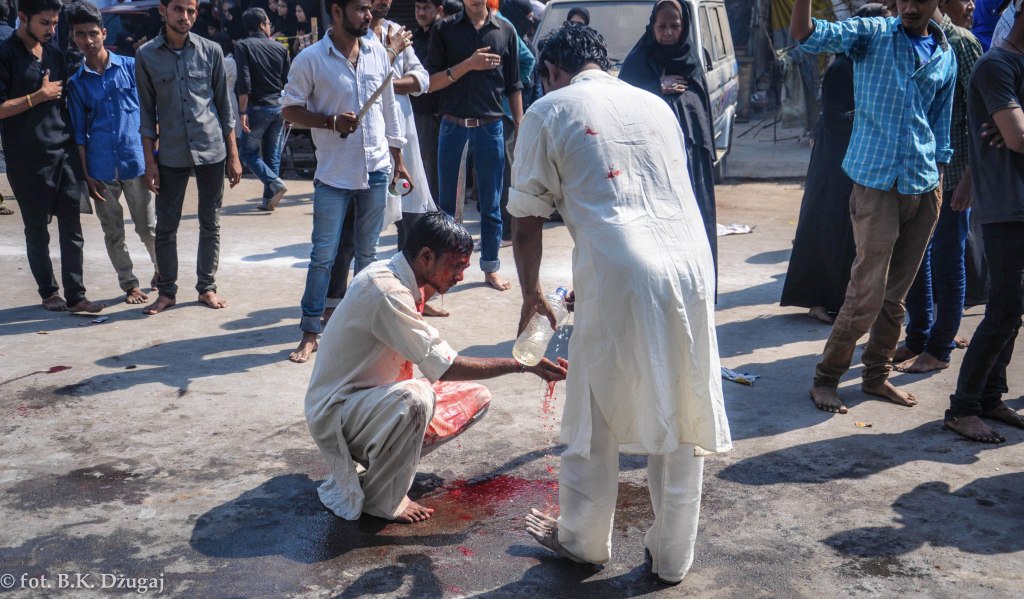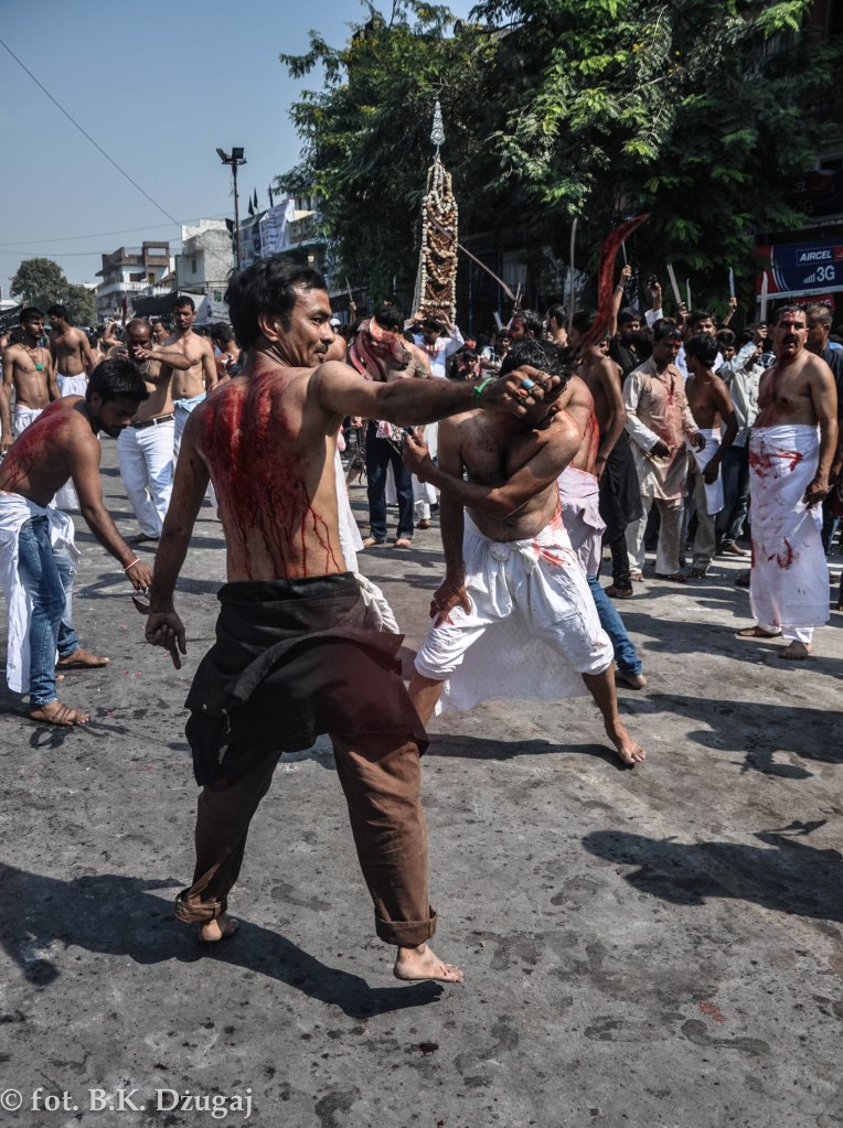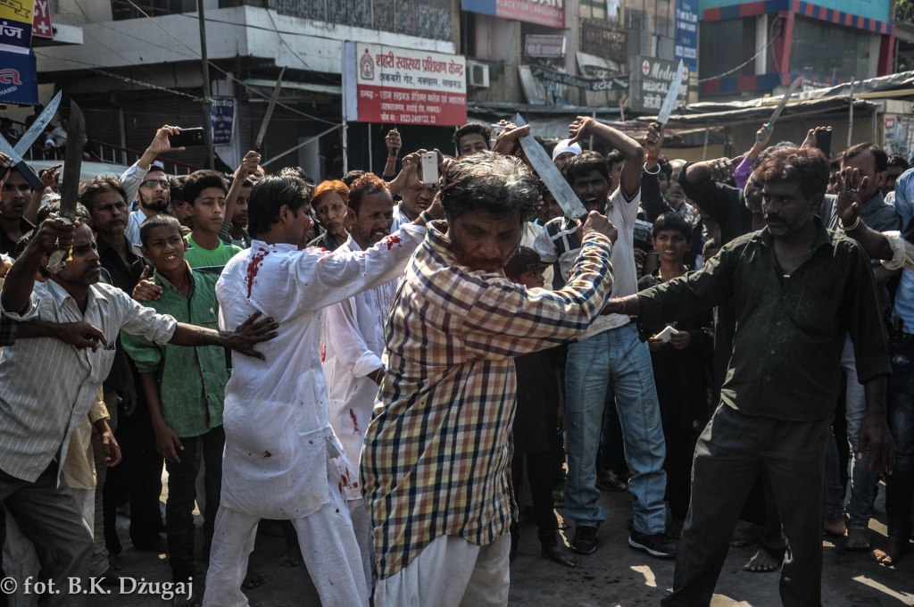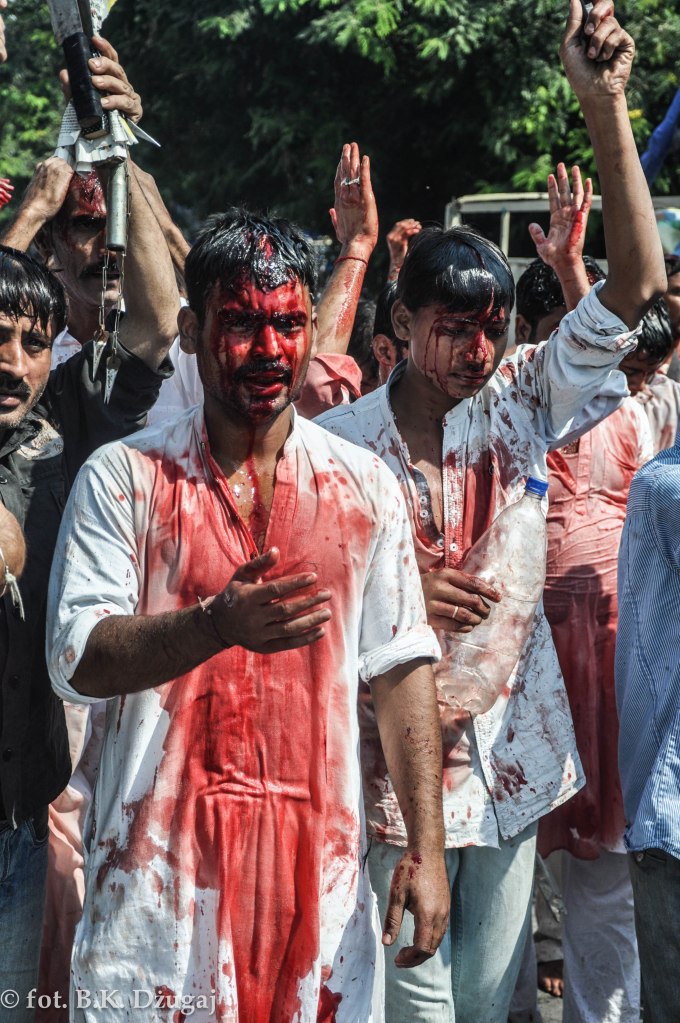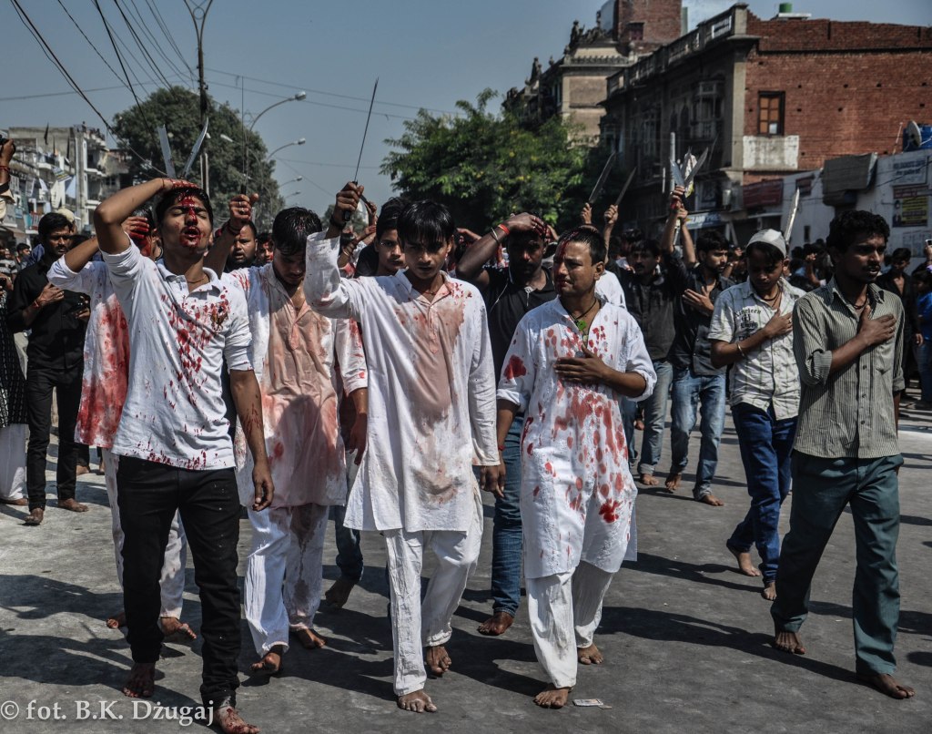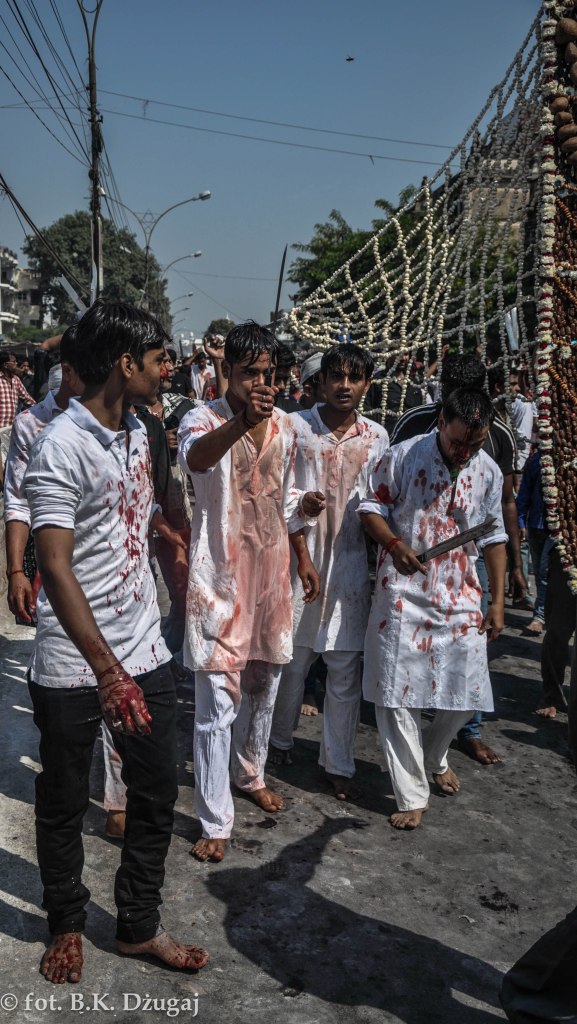 Wlazłam w sam środek procesji. Wystraszyłam się lekko tylko raz, gdy procesję muzułmanów mijał pochód hinduistyczny. Obchody dnia Aszury w 2015 roku zbiegły się bowiem z ważnymi świętami hinduizmu: dasarą oraz durgapudźą. Szyickie procesje spotkały się na ulicach Lakhnau z przygotowywanymi przez hindusów ołtarzami. Różnie mogło się to skończyć, obyło się jednak bez otwartej wrogości. Aszura to jedno z najbardziej emocjonalnych doświadczeń w moim życiu. Krew zmywałam z aparatu fotograficznego jeszcze w pociągu do Delhi, adrenalina opuściła mnie dopiero następnego dnia. Rok później w badaniach terenowych skupiłam się już wyłącznie na performansie, do kwestii szału religijnego zamierzam jednak jeszcze powrócić.