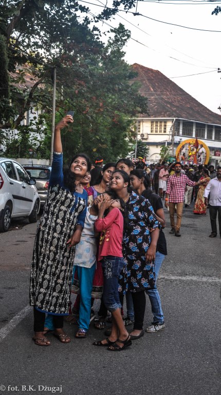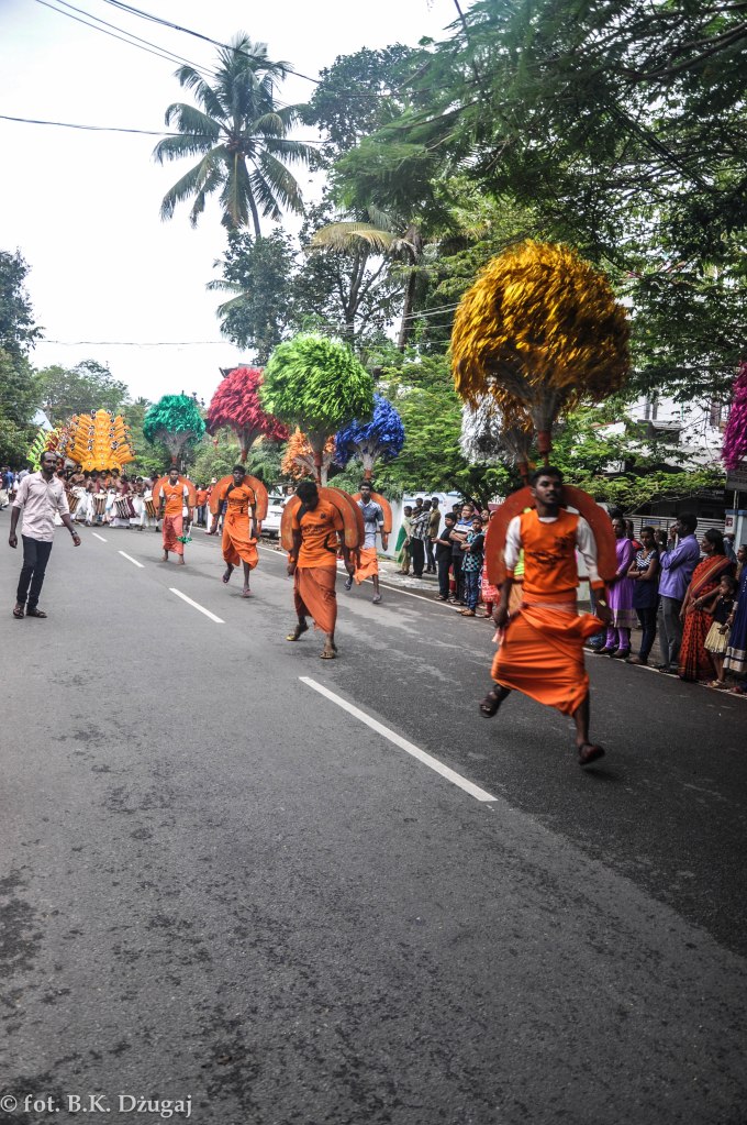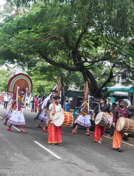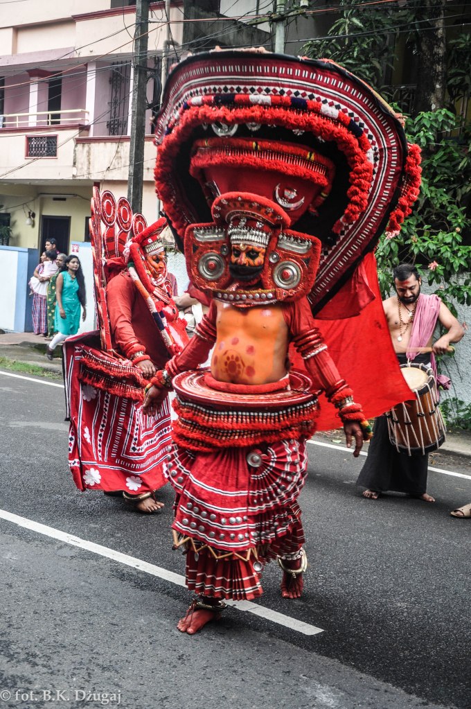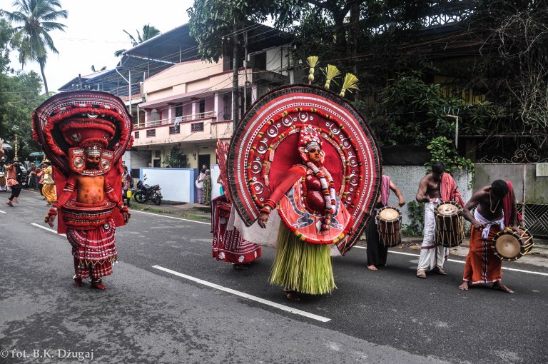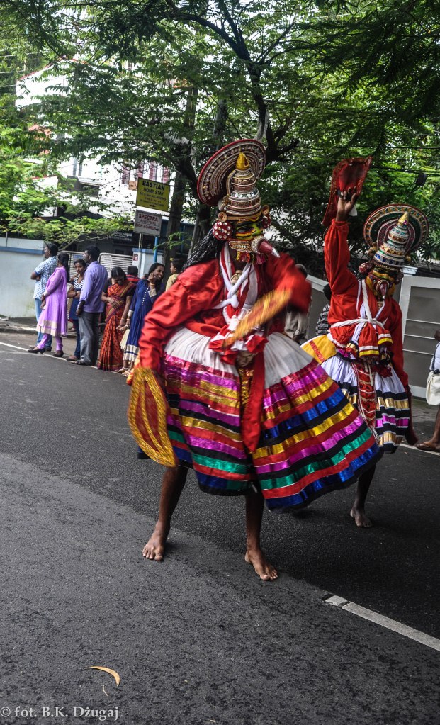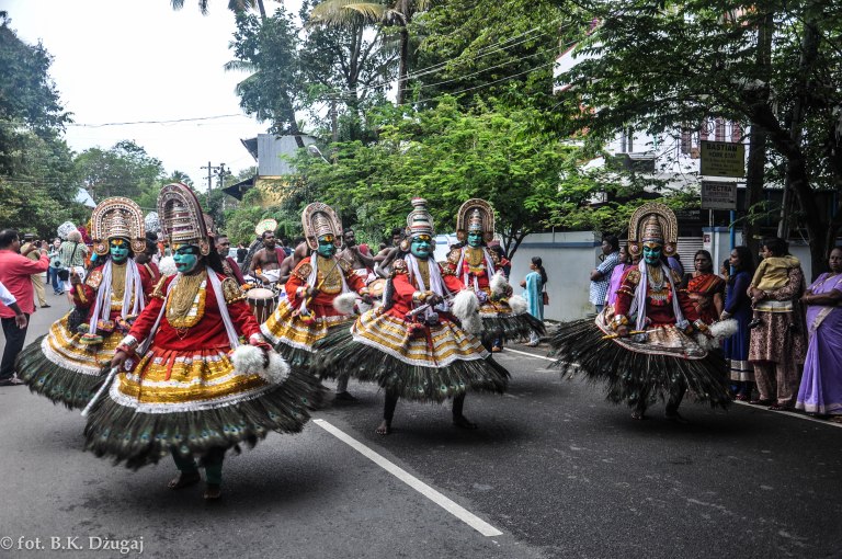 Barwne i głośne parady przechodzą m.in. ulicami starego Koczinu. I to właśnie z tego względu wybrałam mieszkanie w tej części miasta. Do świątyni Thrikkakara dojeżdżałam codziennie przez ok. półtorej godziny, żeby zobaczyć powitanie Vamany musiałam więc wstać o 5 rano. Po powrocie do Koczinu jedyne o czym marzyłam to łóżko i sen. Cudnie mi się spało przy szumie jednego z ostatnich monsunowych deszczy, mimo że upał nie zelżał nawet na moment. Dla odmiany obudził mnie nie głos muezzina z pobliskiego meczetu, lecz dźwięki bębnów. Dupatta na głowę, aparat w rękę i wypadłam prosto w roztańczony korowód przechodzący główną ulicą dzielnicy Fort Koczin.