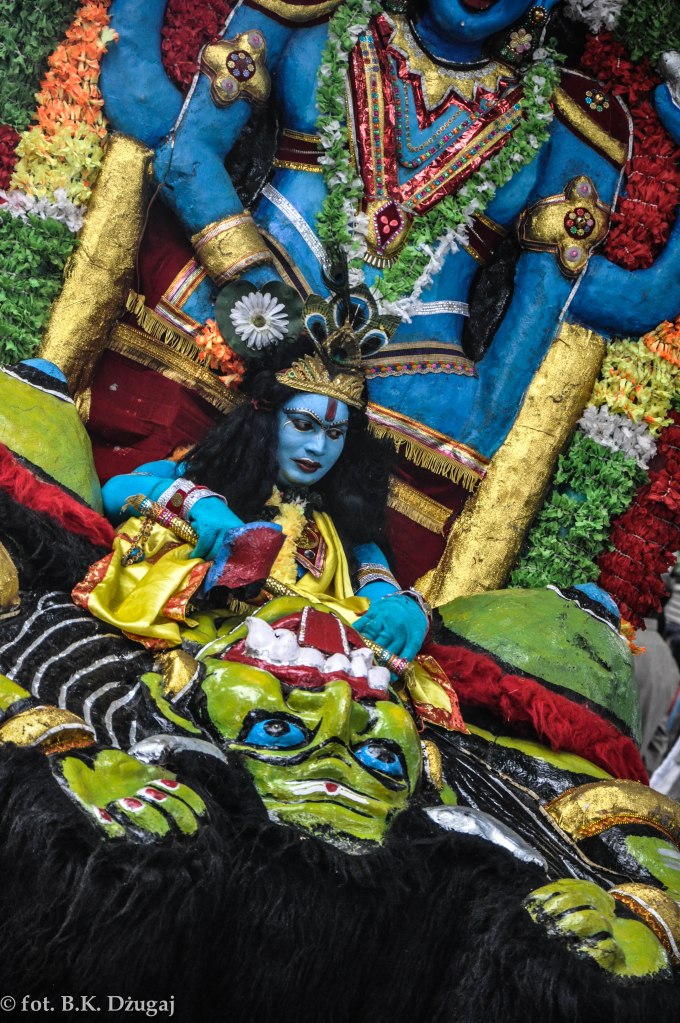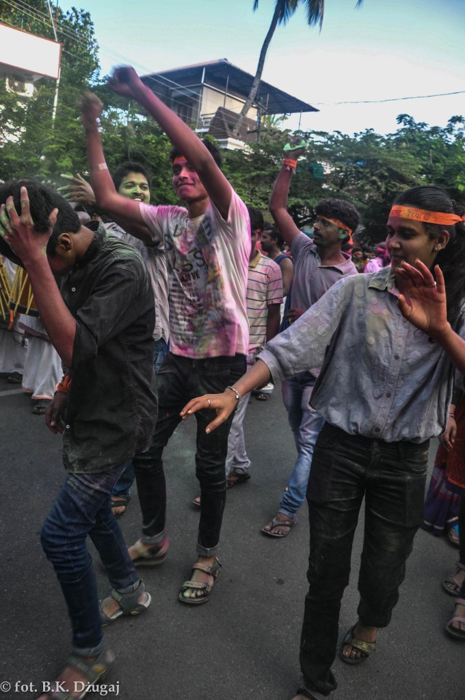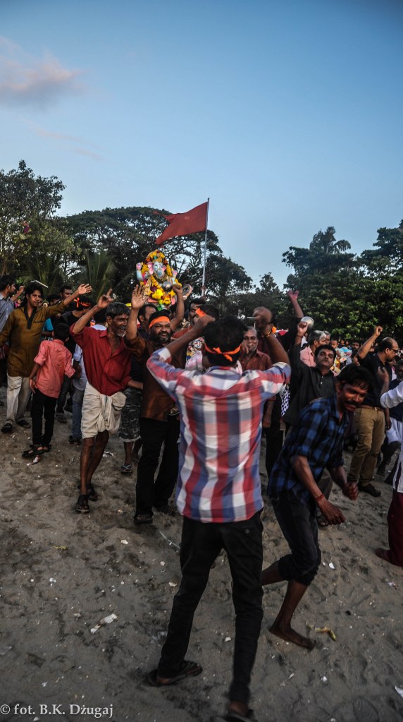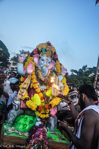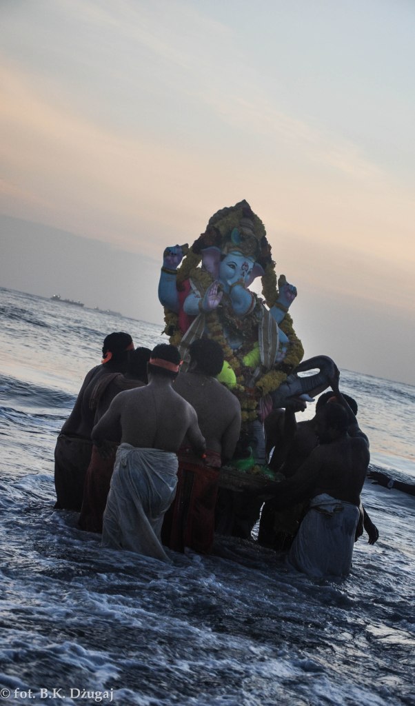Następny dzień miał być dniem odpoczynku. Tylko odsypianie poprzednich nocy, jedzenie, spacery po plaży lub starej części Koczinu. Wierzcie lub nie, ale nawet ja mam ograniczone zasoby energii, a upał i schodząca adrenalina zrobiły swoje – wiedziałam już, że mam wystarczająco dużo materiału, żeby rozliczyć projekt badawczy, mogłam więc odetchnąć i wreszcie się wyspać. Nic z tego, moją ulicą przechodziła bowiem kolejna parada. Mniej barwna niż ta ze środy, dla mnie fascynująca jednak z zupełnie innego powodu. To był ostatni dzień Onam, zgodnie z hinduską tradycją, miało więc nastąpić zatopienie bóstwa – z braku Gangesu w wodach Morza Arabskiego. Bóstwem tym był Ganeśa, bóg o głowie słonia, uwielbiany w całych Indiach jako niebianin usuwający przeszkody i zapewniający powodzenie. Posąg Ganeśi, ulokowany na bogato przystrojonej platformie, przejechał całe miasto, aż do plaży w Fort Koczin. Tam została odprawiona pudźa, z której byłam pewna, że zostanę grzecznie relegowana jako osoba mogąca skalać hinduskich wiernych. Ku mojemu zaskoczeniu, sami kapłani podprowadzili mnie do samego posągu Ganeśi, żebym miała lepszy widok. Tacy są Keralczycy – otwarci i serdeczni, chętni do pomocy i uczynni. Domyślacie się jak się skończyła uroczystość na plaży? Oczywiście, wlazłam do morza po pas, żeby zrobić zdjęcia. Do domu wracałam mokrusieńka, ale szczęśliwa.
