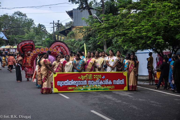 Na czele korowodu szli muzycy, tuż za nimi natomiast tancerze w tradycyjnych strojach. Tancerze Kathakali, wyróżniający się imponującymi przybraniami głów i twarzami umalowanymi na zielono, odgrywali sceny z mitu o królu Mahabalim i Vamanie. Artyści uprawiający Kummattikali ubrani byli w kostiumy wykonane z trawy i drewniane maski, tancerze Theyyam natomiast mieli na sobie fantastyczne kostiumy w kolorze czerwonym. Wśród tancerzy znalazło się także kilku mężczyzn-tygrysów, najwyraźniej gotowych już na odbywające się cztery dni później Pulikali.