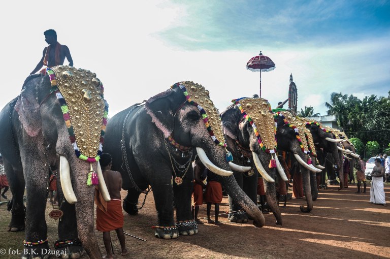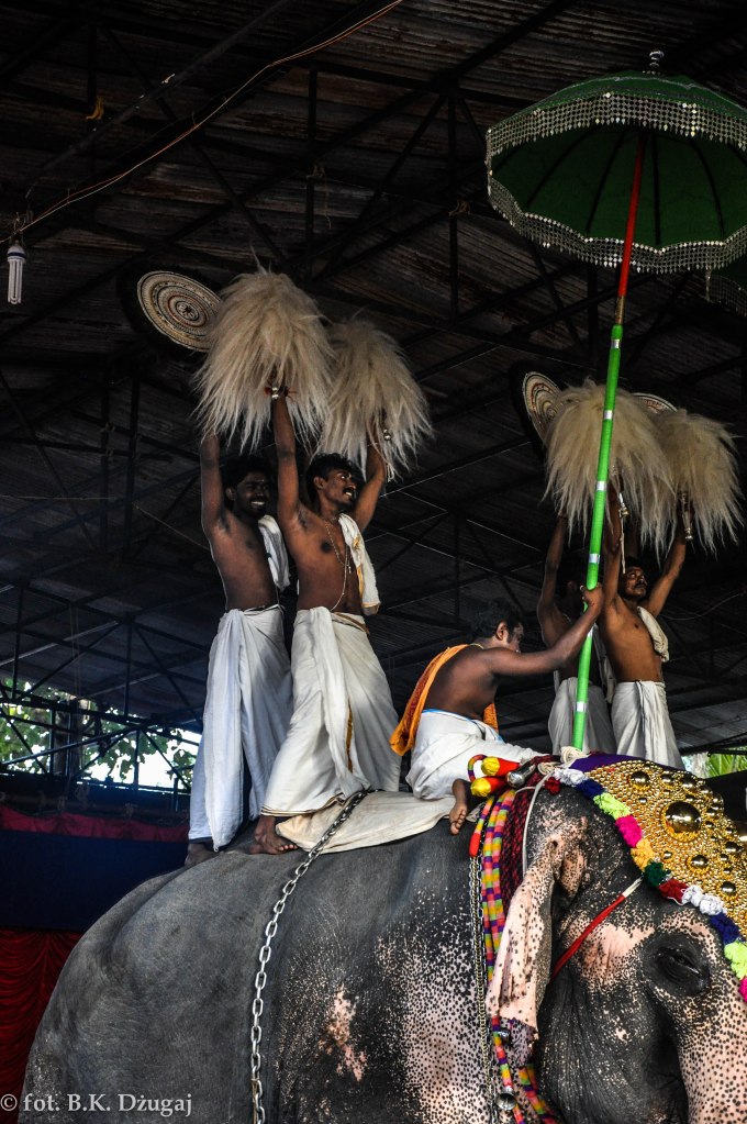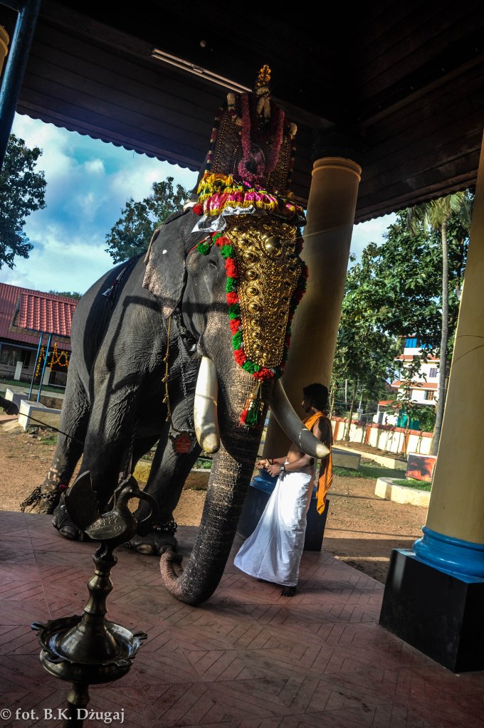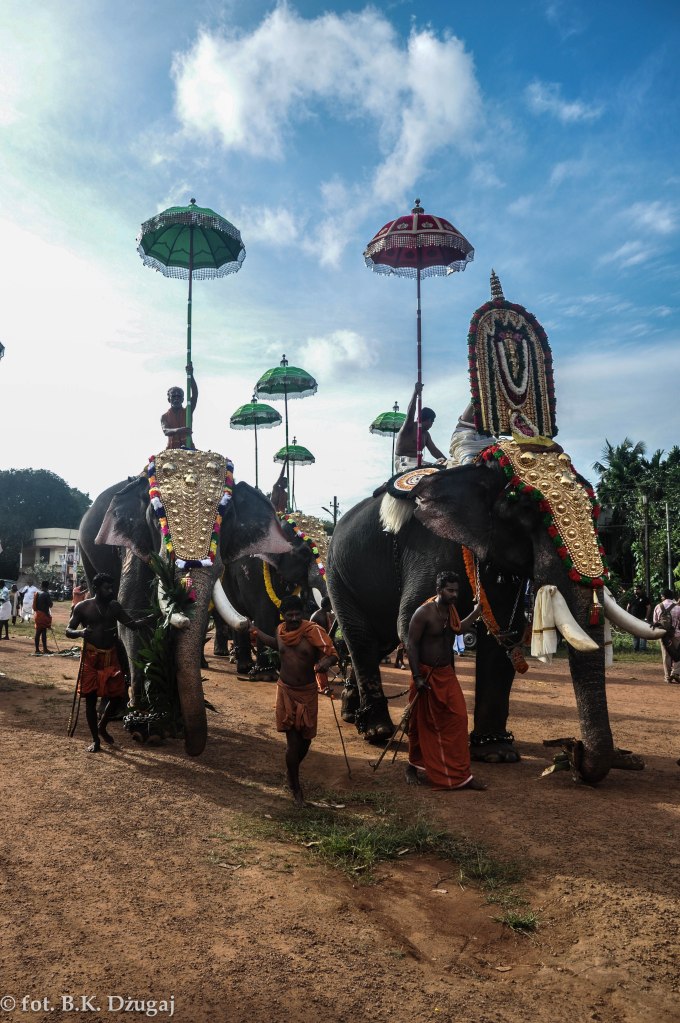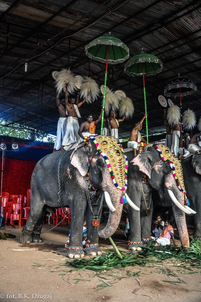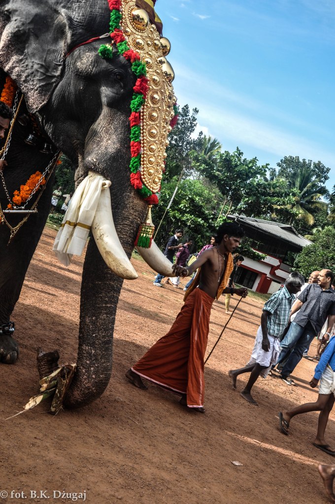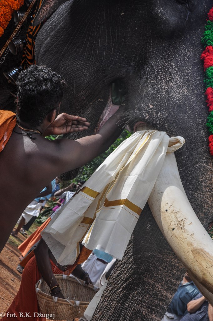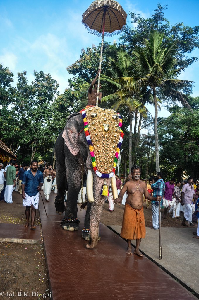 Największa procesja, zwana Pakalpooram, odbywa się dziewiątego dnia Onam. Trwa znacznie dłużej niż Seeveli, wychodzi bowiem poza teren kompleksu świątynnego. Tej procesji długo nie zapomnę, a z pewnością nie zapomną jej moje stopy… Po terenie kompleksu trzeba chodzić boso, co nie jest problemem, dziedziniec wyłożony jest bowiem płaskimi kamieniami lub wysypany piaskiem. Gorzej, gdy nagle trzeba wyjść na wyłożoną żwirem ulicę, a buty zostały w zupełnie innej części kompleksu…Serio, gdy mówię, że w ramach pracy naukowej biegałam na bosaka po żwirze goniąc z aparatem za słoniami, większość ludzi patrzy na mnie co najmniej dziwnie. Wracając do meritum jednak: w Pakalpooram bierze udział dziewięć słoni, rzecz jasna pod przewodnictwem zwierzęcia będącego rumakiem Vamany. Ten słoń zostaje uroczyście nakarmiony świeżo zebranym ziarnem i bananami, co ma stanowić podziękowanie za dobre zbiory i modlitwę o podobne powodzenie w przyszłości. Słonie skute są łańcuchami, nie ma więc niebezpieczeństwa, że zrobią krzywdę uczestnikom procesji, ale… Właśnie, „ale”. Keralczycy coraz głośniej mówią o zakazaniu wykorzystywania słoni w ceremoniach religijnych, dostrzegając że stanowi to dla nich męczarnię. Niewykluczone więc, że wkrótce prawdziwe zwierzęta zostaną zastąpione figurami zrobionymi z papier-maché, jakie widziałam w Triśurze podczas Pulikali.