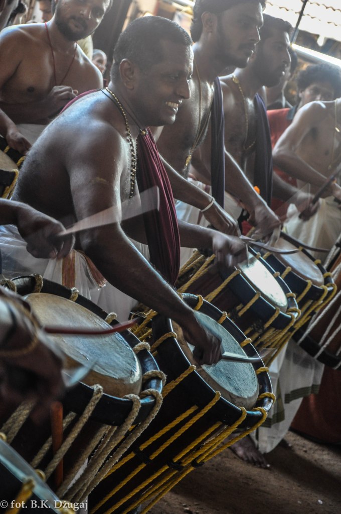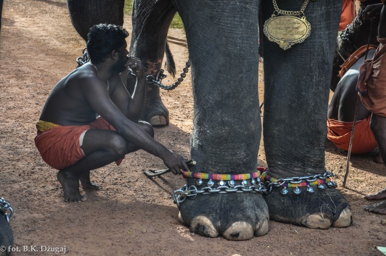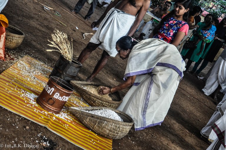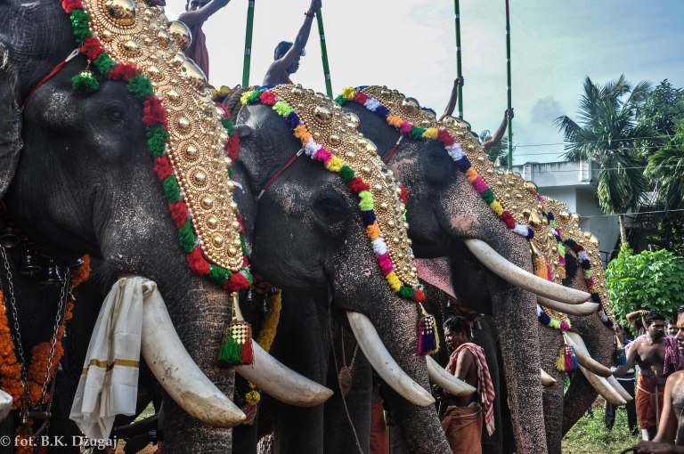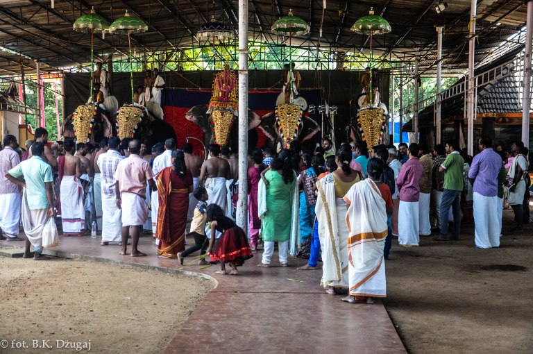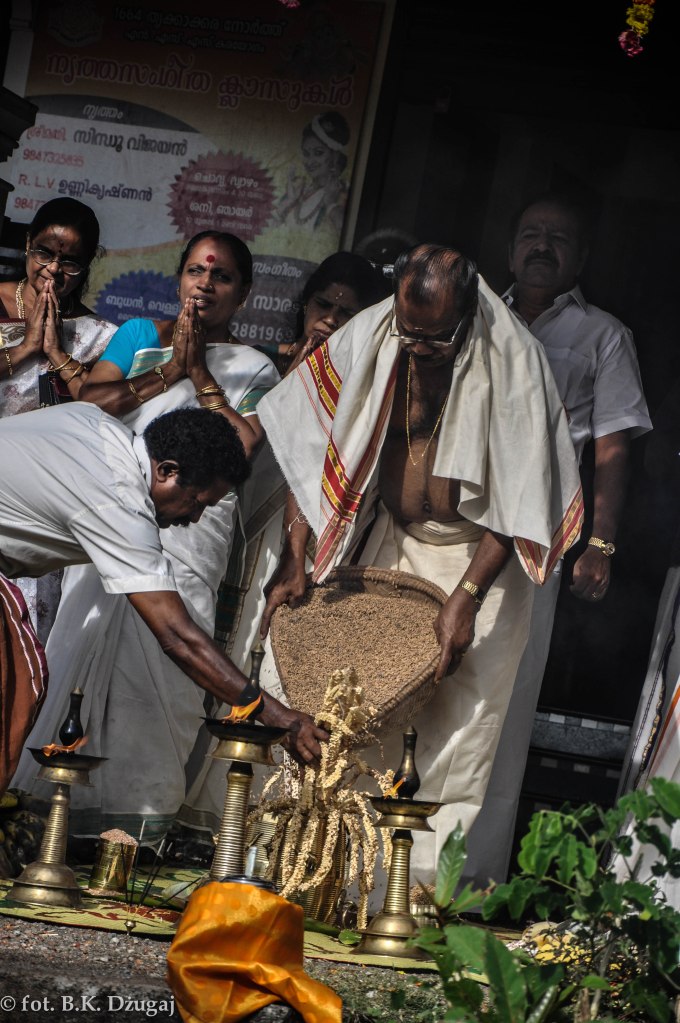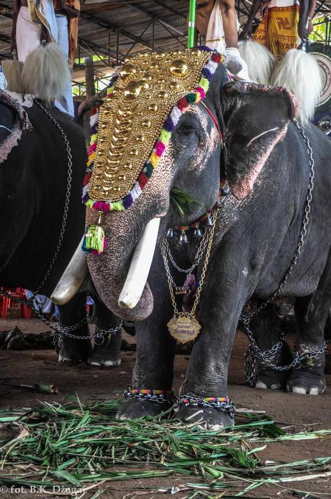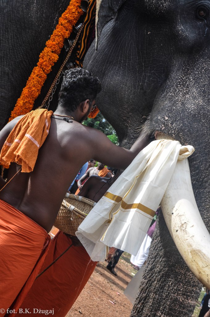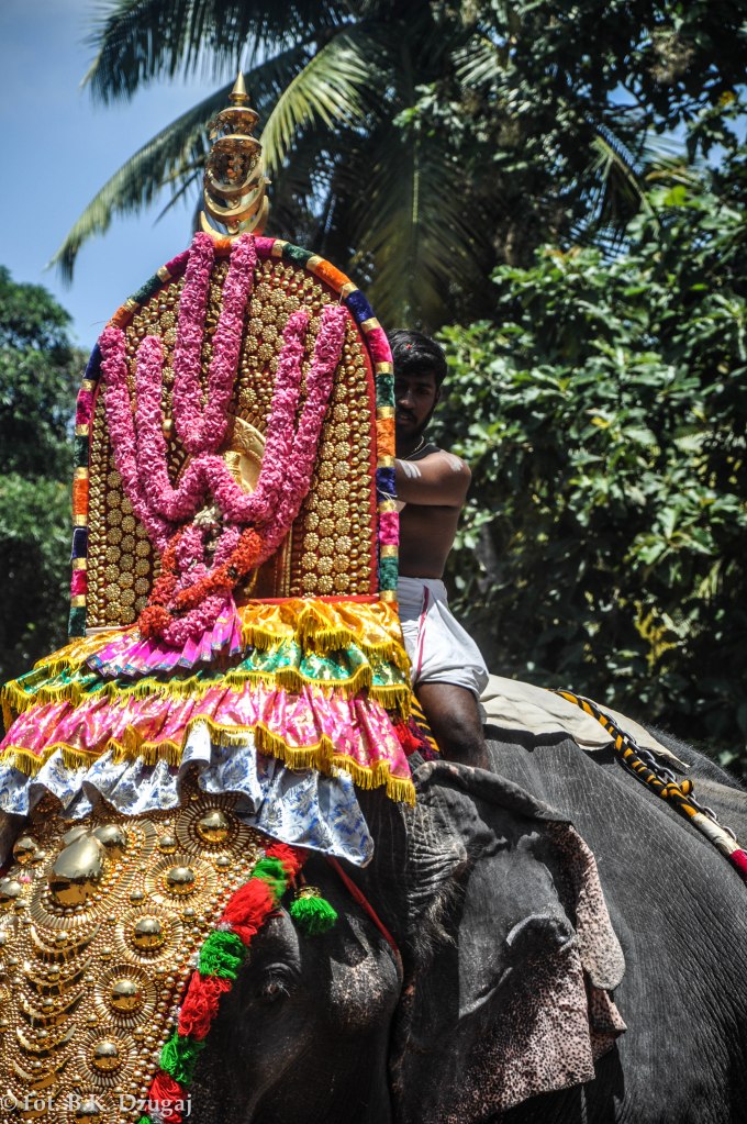 Największa procesja, zwana Pakalpooram, odbywa się dziewiątego dnia Onam. Trwa znacznie dłużej niż Seeveli, wychodzi bowiem poza teren kompleksu świątynnego. Tej procesji długo nie zapomnę, a z pewnością nie zapomną jej moje stopy… Po terenie kompleksu trzeba chodzić boso, co nie jest problemem, dziedziniec wyłożony jest bowiem płaskimi kamieniami lub wysypany piaskiem. Gorzej, gdy nagle trzeba wyjść na wyłożoną żwirem ulicę, a buty zostały w zupełnie innej części kompleksu…Serio, gdy mówię, że w ramach pracy naukowej biegałam na bosaka po żwirze goniąc z aparatem za słoniami, większość ludzi patrzy na mnie co najmniej dziwnie. Wracając do meritum jednak: w Pakalpooram bierze udział dziewięć słoni, rzecz jasna pod przewodnictwem zwierzęcia będącego rumakiem Vamany. Ten słoń zostaje uroczyście nakarmiony świeżo zebranym ziarnem i bananami, co ma stanowić podziękowanie za dobre zbiory i modlitwę o podobne powodzenie w przyszłości. Słonie skute są łańcuchami, nie ma więc niebezpieczeństwa, że zrobią krzywdę uczestnikom procesji, ale… Właśnie, „ale”. Keralczycy coraz głośniej mówią o zakazaniu wykorzystywania słoni w ceremoniach religijnych, dostrzegając że stanowi to dla nich męczarnię. Niewykluczone więc, że wkrótce prawdziwe zwierzęta zostaną zastąpione figurami zrobionymi z papier-maché, jakie widziałam w Triśurze podczas Pulikali.