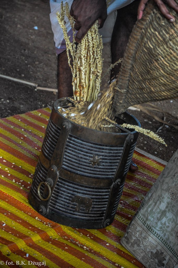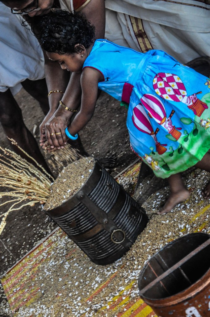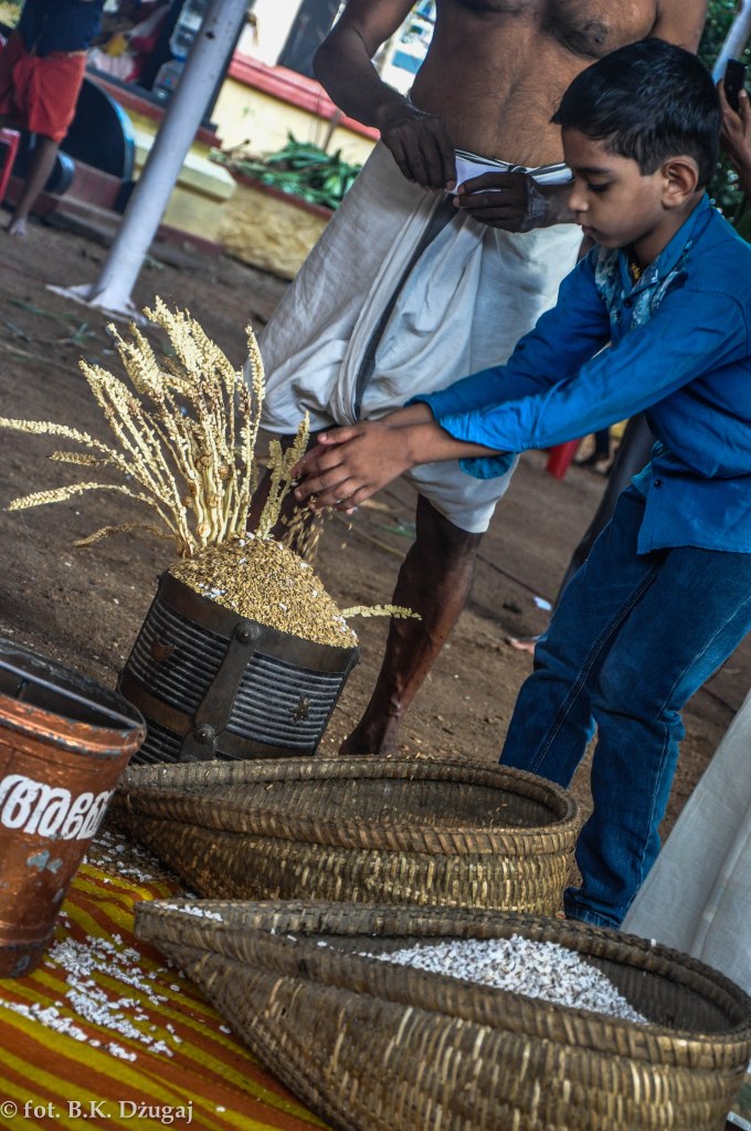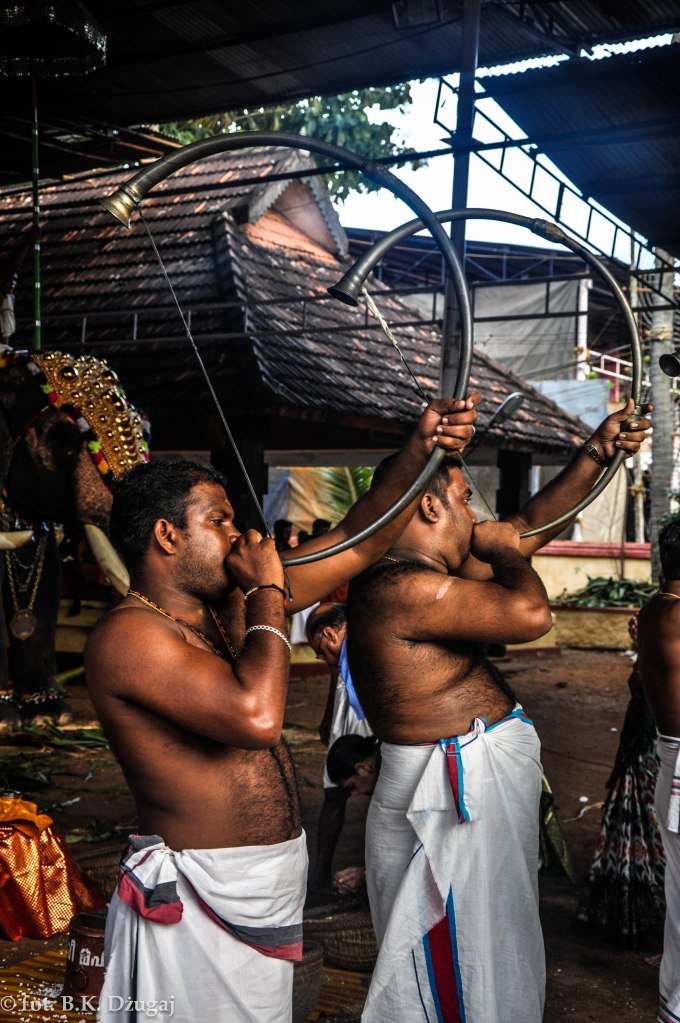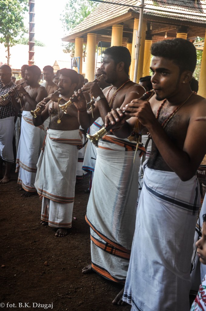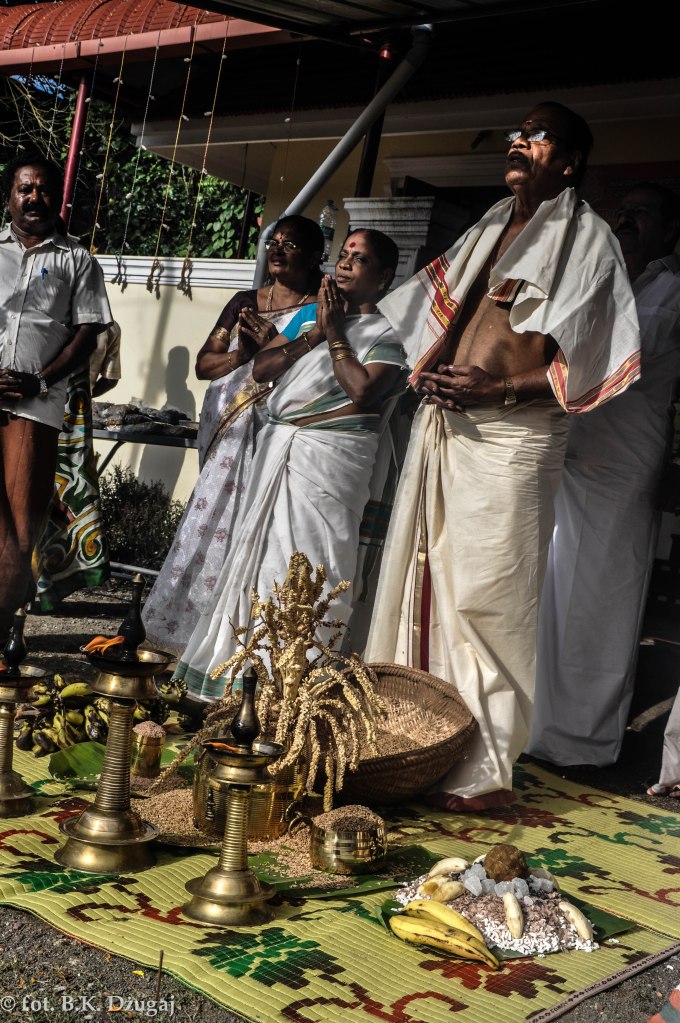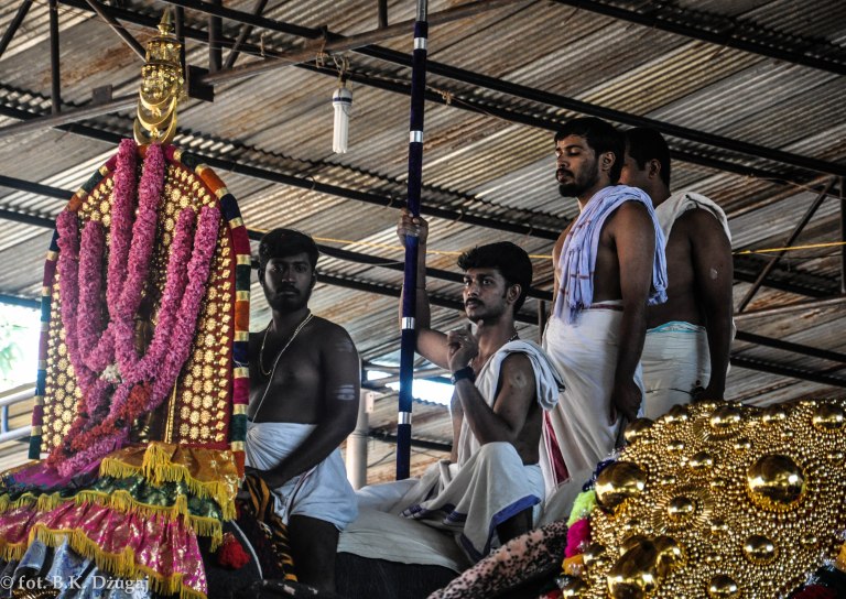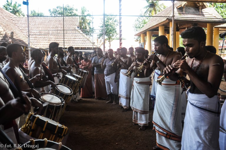 Największa procesja, zwana Pakalpooram, odbywa się dziewiątego dnia Onam. Trwa znacznie dłużej niż Seeveli, wychodzi bowiem poza teren kompleksu świątynnego. Tej procesji długo nie zapomnę, a z pewnością nie zapomną jej moje stopy… Po terenie kompleksu trzeba chodzić boso, co nie jest problemem, dziedziniec wyłożony jest bowiem płaskimi kamieniami lub wysypany piaskiem. Gorzej, gdy nagle trzeba wyjść na wyłożoną żwirem ulicę, a buty zostały w zupełnie innej części kompleksu…Serio, gdy mówię, że w ramach pracy naukowej biegałam na bosaka po żwirze goniąc z aparatem za słoniami, większość ludzi patrzy na mnie co najmniej dziwnie. Wracając do meritum jednak: w Pakalpooram bierze udział dziewięć słoni, rzecz jasna pod przewodnictwem zwierzęcia będącego rumakiem Vamany. Ten słoń zostaje uroczyście nakarmiony świeżo zebranym ziarnem i bananami, co ma stanowić podziękowanie za dobre zbiory i modlitwę o podobne powodzenie w przyszłości. Słonie skute są łańcuchami, nie ma więc niebezpieczeństwa, że zrobią krzywdę uczestnikom procesji, ale… Właśnie, „ale”. Keralczycy coraz głośniej mówią o zakazaniu wykorzystywania słoni w ceremoniach religijnych, dostrzegając że stanowi to dla nich męczarnię. Niewykluczone więc, że wkrótce prawdziwe zwierzęta zostaną zastąpione figurami zrobionymi z papier-maché, jakie widziałam w Triśurze podczas Pulikali.