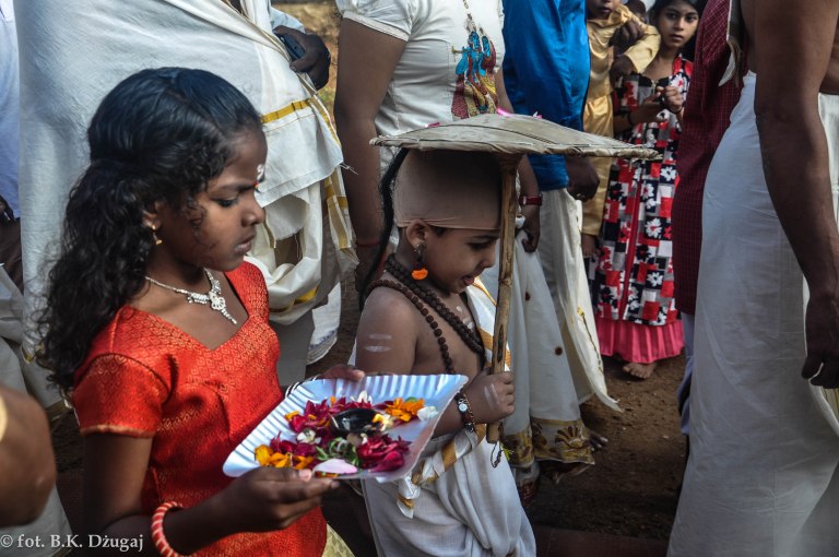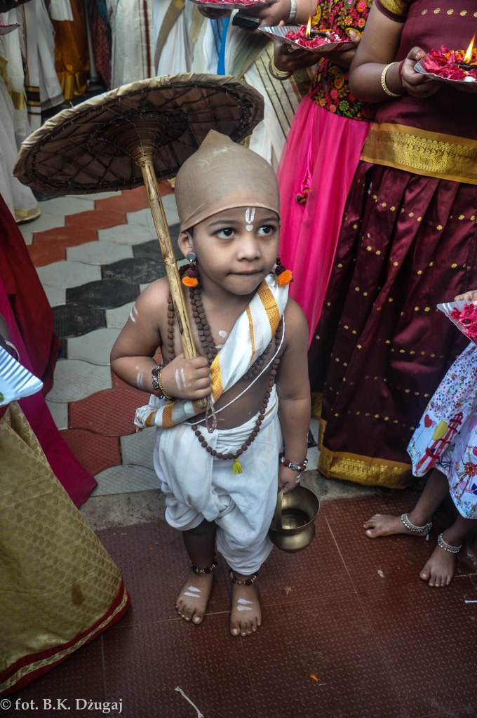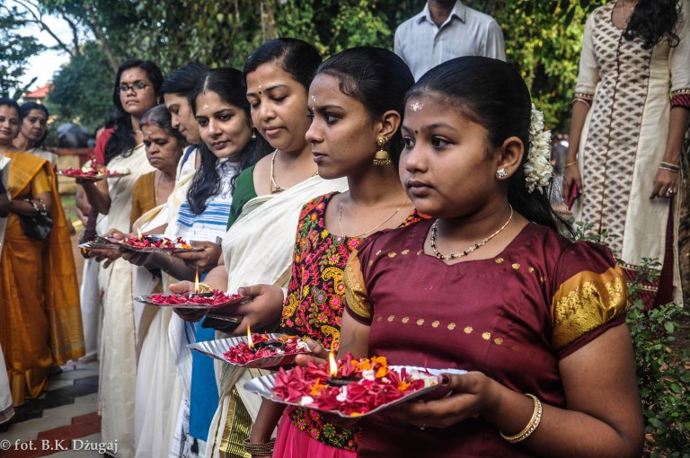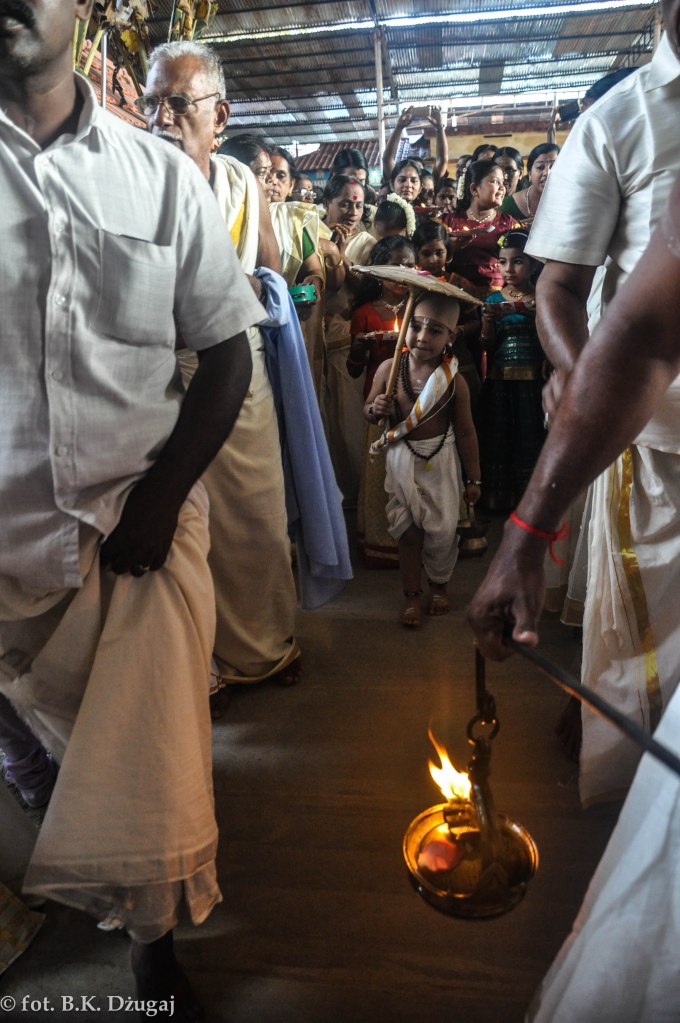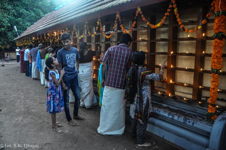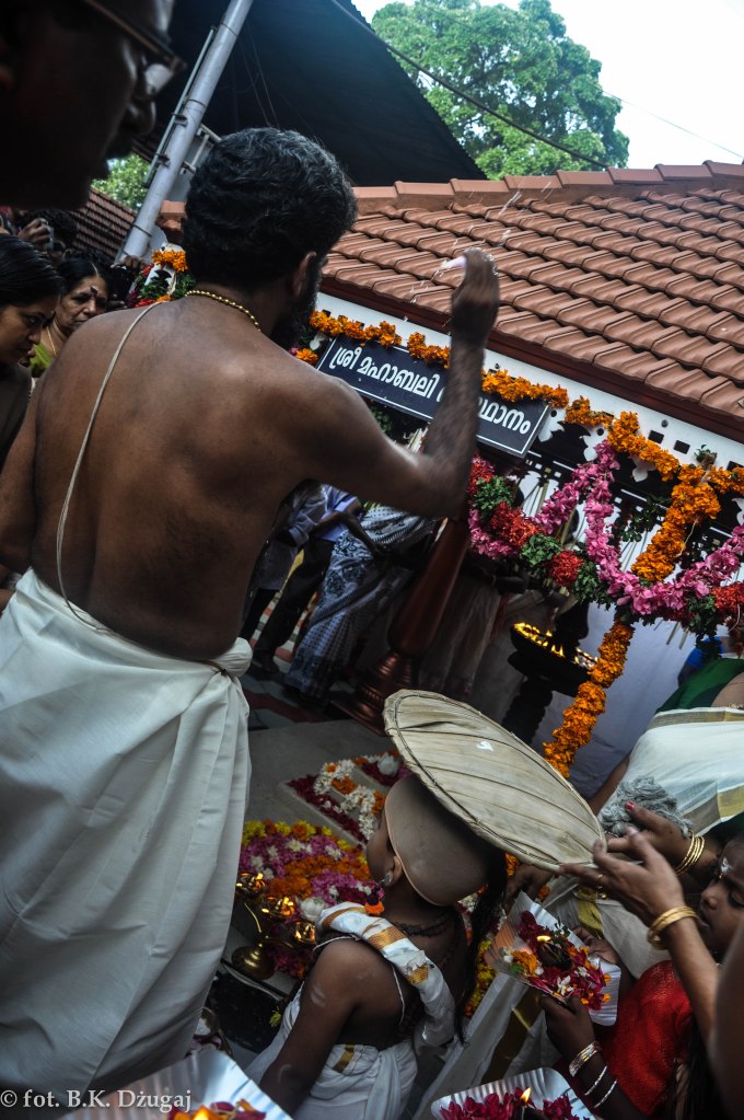 Drugiego z trzech dni, jakie spędziłam w Thrikkakara, punktualnie o godzinie 18.00 uczestnicy uroczystości zapalili lampki rozstawione na czterech ścianach świątyni. Nazajutrz o poranku, ostatniego dnia święta Onam, w świątyni miało natomiast miejsce powitanie Vamany. Ta awatara Wisznu przedstawiana jest w ikonografii jako karzeł trzymający drewnianą parasolkę. Podczas uroczystości w Thrikkakara w postać Vamany wcielił się kilkuletni chłopiec, krewny jednego z kapłanów. Został uroczyście powitany przy wejściu do świątyni, a następnie oprowadzony wokół kompleksu w procesji. Na czele, której kroczył słoń – jakżeby inaczej. Ta ceremonia zgromadziła nie tylko rekordową liczbę wiernych, ale także media, zwłaszcza lokalne telewizje. Jeśli zastanawiacie się, czy zdołałam uciec przed kamerą, to odpowiedź brzmi: nie. Chociaż się starałam. W efekcie byłam „gwiazdą” programu na żywo stacji Amrita TV.
