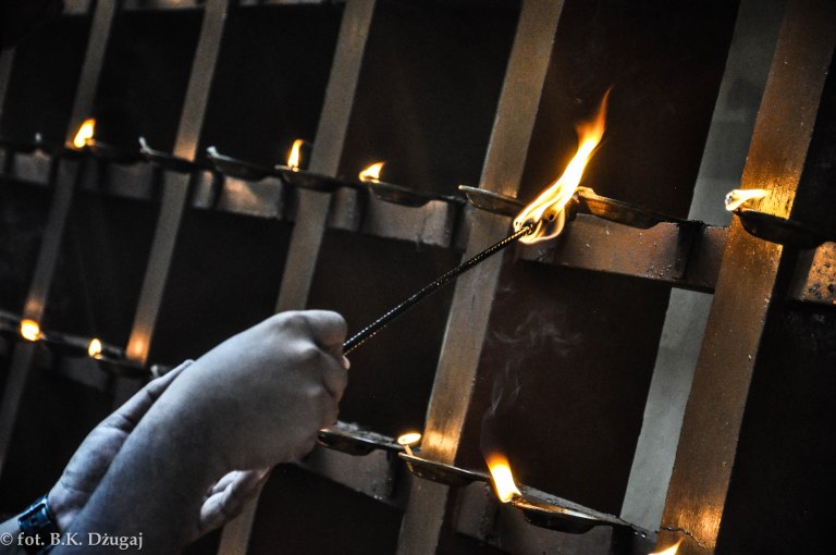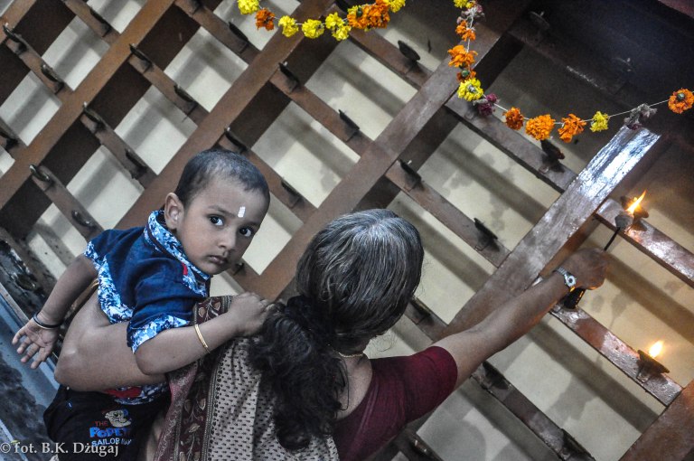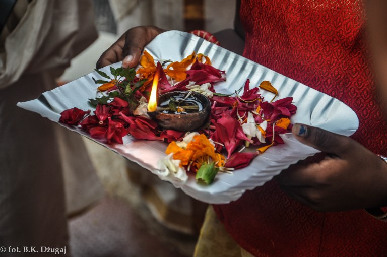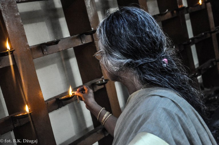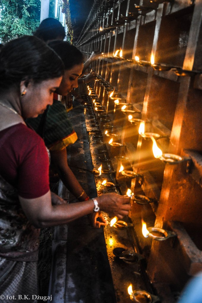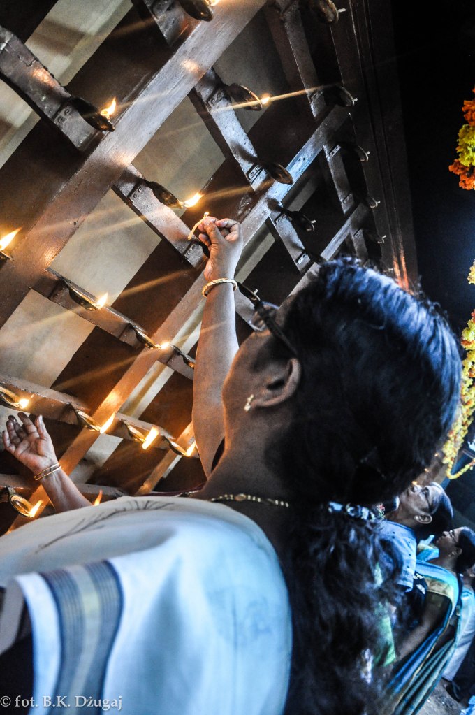 Drugiego z trzech dni, jakie spędziłam w Thrikkakara, punktualnie o godzinie 18.00 uczestnicy uroczystości zapalili lampki rozstawione na czterech ścianach świątyni. Nazajutrz o poranku, ostatniego dnia święta Onam, w świątyni miało natomiast miejsce powitanie Vamany. Ta awatara Wisznu przedstawiana jest w ikonografii jako karzeł trzymający drewnianą parasolkę. Podczas uroczystości w Thrikkakara w postać Vamany wcielił się kilkuletni chłopiec, krewny jednego z kapłanów. Został uroczyście powitany przy wejściu do świątyni, a następnie oprowadzony wokół kompleksu w procesji. Na czele, której kroczył słoń – jakżeby inaczej. Ta ceremonia zgromadziła nie tylko rekordową liczbę wiernych, ale także media, zwłaszcza lokalne telewizje. Jeśli zastanawiacie się, czy zdołałam uciec przed kamerą, to odpowiedź brzmi: nie. Chociaż się starałam. W efekcie byłam „gwiazdą” programu na żywo stacji Amrita TV.