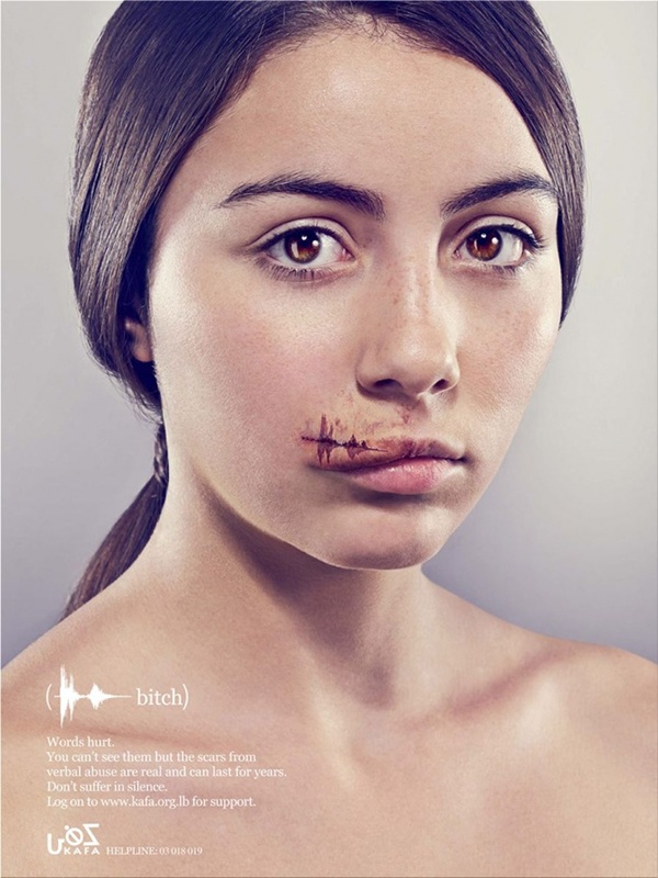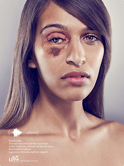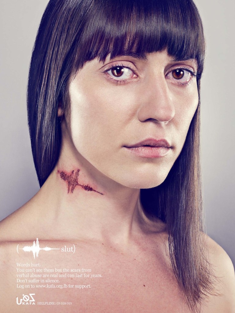 Słowa mogą ranić równie mocno jak cios pięścią. Tych, którzy nie znają tej prostej prawdy usiłowała przekonać libańska kampania z 2013 roku. Przeprowadzona została ona przez organizację pozarządową o wymownej nazwie KAFA (arab. dość) i opierała się na plakatach przedstawiających twarze kobiet noszące ślady przemocy. Ich rany i blizny imitowały kształt fal dźwiękowych słów, które zostały użyte przeciwko tym kobietom: kurwa, dziwka, suka.