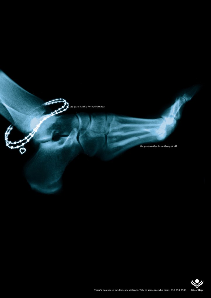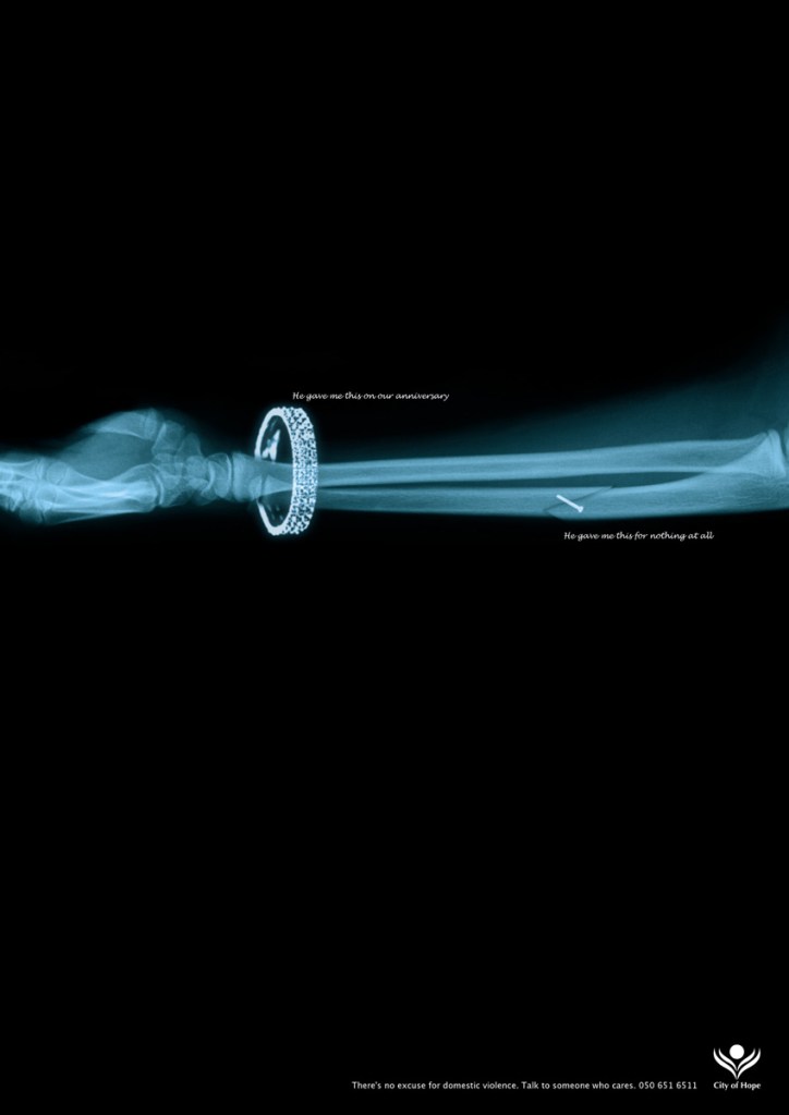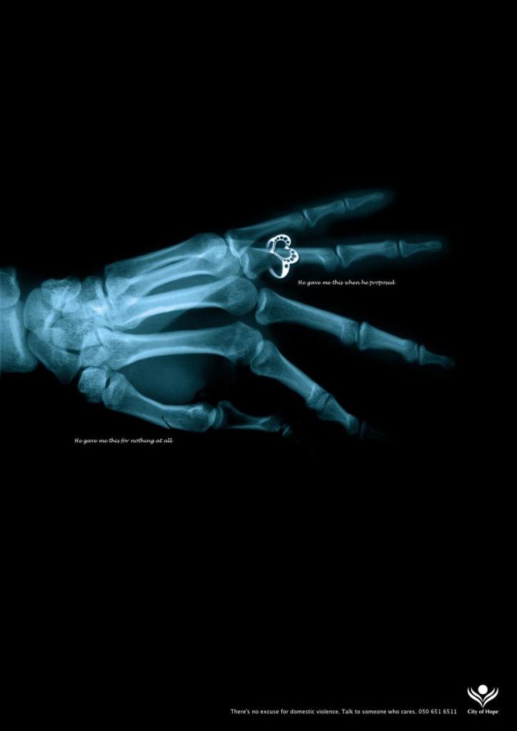 Jeszcze w tym samym roku City of Hope zainaugurowało kolejną kampanię. W ramach akcji przygotowano serię plakatów w formie zdjęć rentgenowskich oraz spot pod wspólnym hasłem: nie ma usprawiedliwienia dla przemocy domowej. Wszystkie zdjęcia przedstawiają części ciała z nałożoną piękną i kosztowną biżuterią i ranami spowodowanymi znęcaniem się. Na jednym ze zdjęć widnieje przedramię z diamentową bransoletką, z napisem: he gave me this on our anniversary (dał mi to z okazji naszej rocznicy). Uważny odbiorca zauważy jednak, że zdjęcie rentgenowskie nie zostało zrobione bez przyczyny: nadgarstek jest bowiem złamany. Pod złamaniem widnieje też napis: he gave mi this for nothing at all (to dostałam od niego bez okazji). Spot to wizualizacja zdjęcia rentgenowskiego w 3D. Kobiecy głos zachwyca się naszyjnikiem otrzymanym w prezencie od męża. Gdy kamera pokazuje bok jej czaszki, okazuje się, że kobieta dostała od męża coś więcej niż biżuterię: cios w głowę. Kampania City of Hope, tym razem przeprowadzona we współpracy z agencją reklamową TBWA/RAAD, została pozytywnie oceniona zarówno przez odbiorców arabskich, jak i zagranicznych. Jej twórcy otrzymali nagrodę w Nowym Jorku, a na działalność City of Hope zwróciły uwagę władze Zjednoczonych Emiratów Arabskich. Dzięki temu w Dubaju powstało kolejne schronisko dla maltretowanych kobiet.