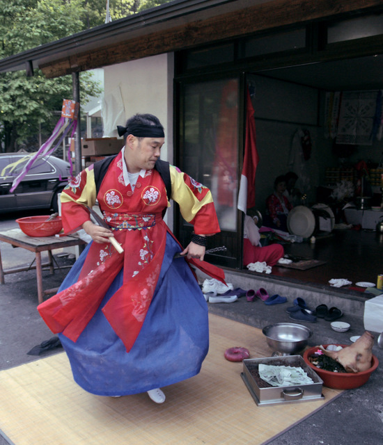 Podstawą praktyki szamańskiej również w Korei są praktyki ekstatyczne. Oczywiście tutaj, tak jak w innych częściach świata są one obudowane określonymi treściami kulturowymi, takimi jak mityczne narracje, panteon bóstw, geografia światów nadprzyrodzonych itd.