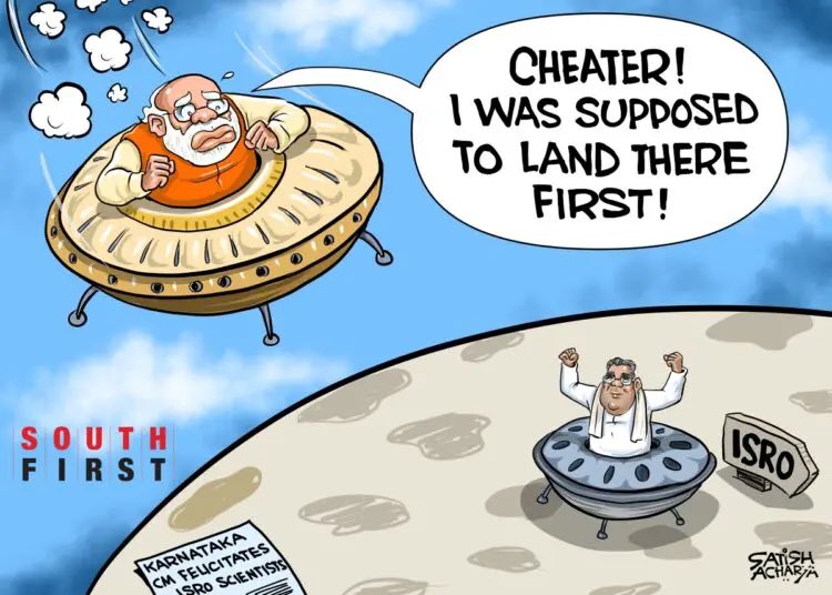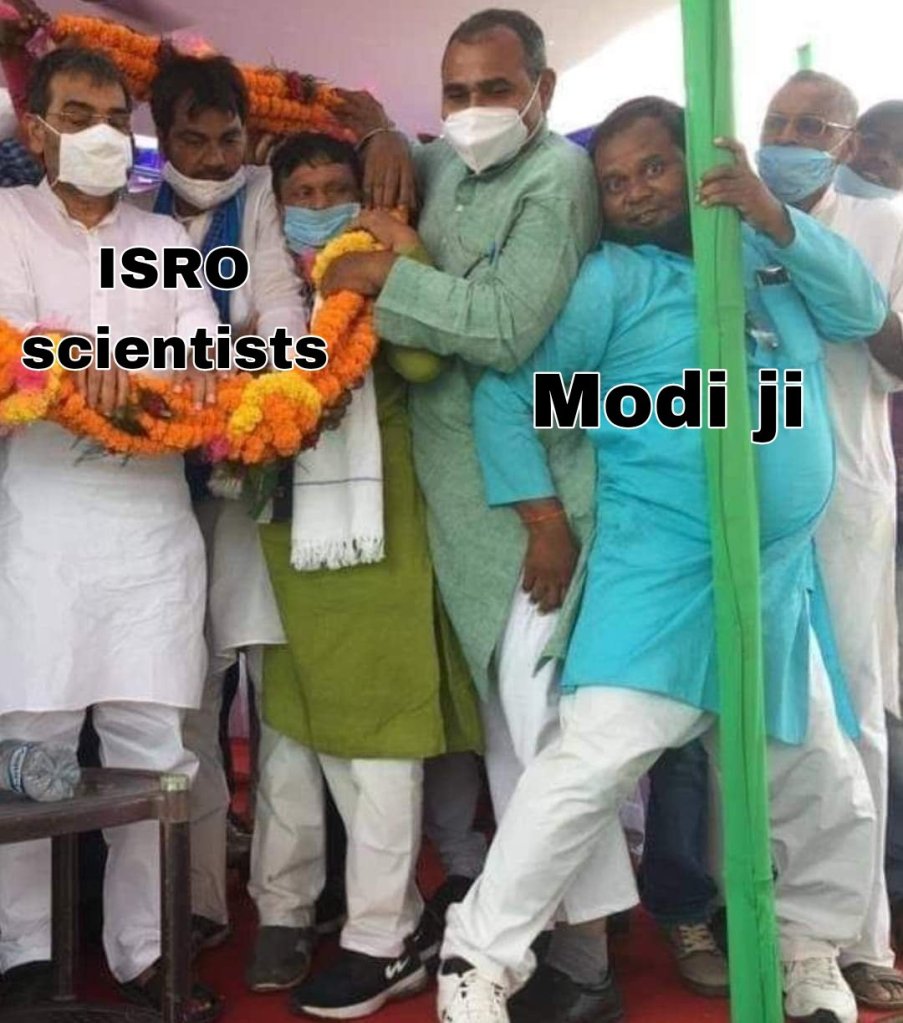 Euforia euforią, ale nie mogło się ostatecznie obejść bez odniesień politycznych, o których częściowo już wspomnieliśmy. Opozycja, a także wielu mieszkańców Indii uznało za rażąco bezczelne odcinanie kuponów przez rządzących i przypisywanie sobie sukcesu, na który realnie pracował zespół naukowców i naukowczyń. Memy, które tę krytykę wyrażają przedstawiają człowieka w bardzo wyraźny sposób zabiegającego o atencję i pojawienie się u boku grupy ludzi. Są oni podpisani jako zespół ISRO, atencjusz zaś jako premier Modi.