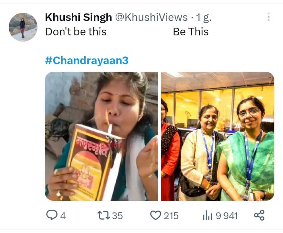 Oprócz dostrzeżenia roli kobiet w realizacji tego projektu oraz podkreślenia jak paradoksalny bywa obecnie status kobiet w Indiach myśli i komentarze internautów skierowały się również w stronę bardzo prozaicznych trudności w funkcjonowaniu w Indiach. ISRO udostępniło pierwsze zdjęcia wykonane przez lądownik Vikram będący elementem Chandrayaan-3. Zdjęcia pokazują wyraźny obraz powierzchni Księżyca wraz z kraterami. Zdjęcie to jednak wywołało lawinę komentarzy i memów ukazujących podobieństwo między powierzchnią księżyca, a dziurawymi indyjskimi drogami, np. Bengaluru Mumbaju czy sąsiadującego z Delhi Gurgaonu. Jeden z użytkowników X zauważył, że: Dziury na Księżycu oznaczają nie tylko, że istnieje tam życie, ale także rządzący. Inny przywołał katastrofalny dla indyjskich dróg i świetnie rozumiany w Indiach obraz i skomentował: Trwa tam pora monsunowa.