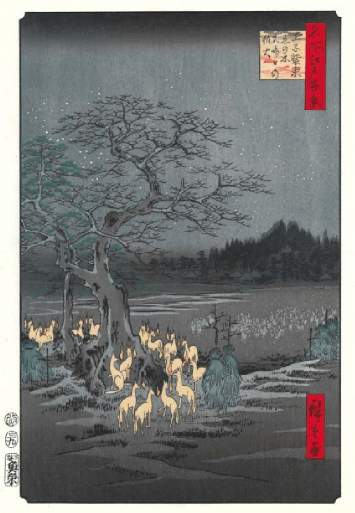 Na koniec warto wspomnieć o jeszcze jednym motywie związanym z lisami – kitsunebi, czyli lisich ognikach. Można je nazwać odpowiednikami europejskich błędnych ogników, ale nieco mniej złowieszczym. Są to tajemnicze światełka widoczne w nocy, które stanowią lampiony lisiej procesji, czy to weselnej, czy noworocznej. Z jednej strony podążanie za nimi może być niebezpieczne, bo nie należy spotkać lisa osobiście, ale z drugiej podejrzenie lisiej procesji ponoć ma przynosić szczęście. Z takich ogników japońscy rolnicy wróżyli powodzenie żniw.