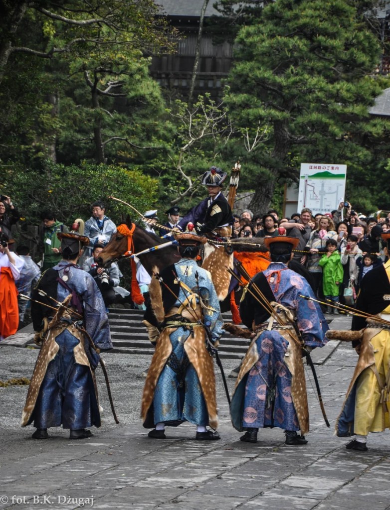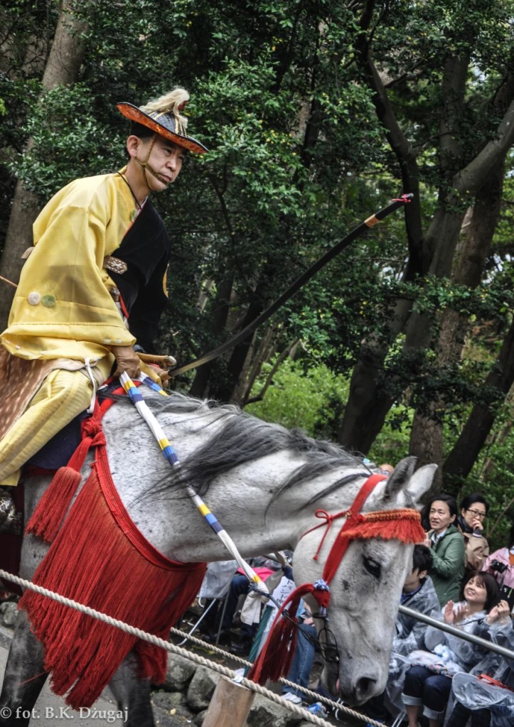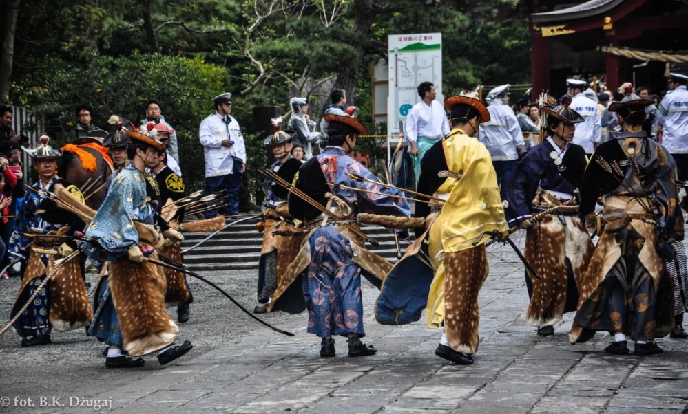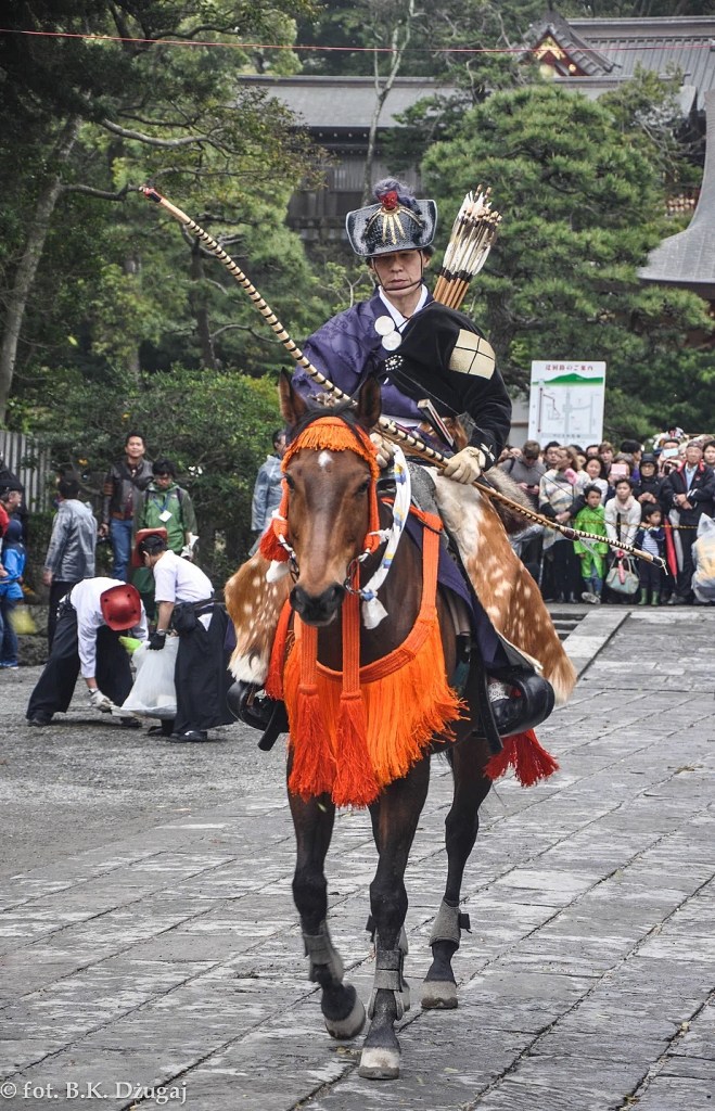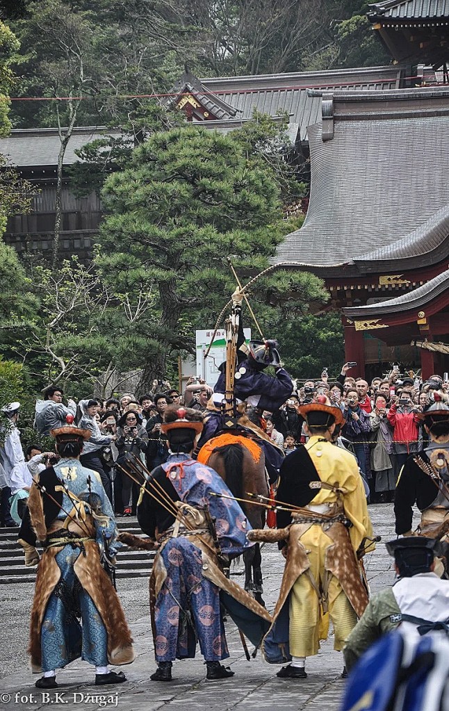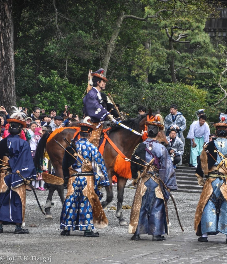 Japończycy kochają wszelkiego rodzaju festiwale, których korzeni szukać należy w kulturze ludowej i najbardziej pierwotnej formie shinto. Ja miłość tę podzielam, oczywistą oczywistością była więc moja obecność na Yabusame Shinji – festiwalu odbywającym się co roku w świątyni Tsurugaoka Hachimangu w Kamakurze. Hachiman, któremu przybytek ten jest poświęcony, to shintoistyczny bóg wojny, a zarazem opiekun Japonii i jej mieszkańców. Uważany jest również za patrona rodu shogunów Minamoto. Konne łucznictwo znane było w Japonii od IV wieku, pierwsza szkoła tej sztuki walki, Takeda, powstała natomiast w IX wieku, gdy konne łucznictwo zyskiwało znaczenie jako element shintoistycznego rytuału, którego celem było zabawienie bóstw spoglądających na Kraj Kwitnącej Wiśni z niebiańskich wyżyn. Założyciel szkoły Takeda, Minamoto no Yoshiari, na polecenie cesarza Uda, sformułował wówczas zasady turniejów yabusame, które w niemal niezmienionej formie obowiązują do dziś. Szczególną popularność konne łucznictwo zyskało jednak dopiero w wieku XII za panowania shoguna Minamoto no Yoritomo. Założyciel shogunatu w Kamakurze dostrzegał wagę yabusame jako elementu walki zbrojnej, rozrywki i części treningu samurajów, oraz rytuału religijnego. W 1187 roku Minamoto no Yoritomo ustanowił pierwszy turniej yabusame w świątyni Tsurugaoka Hachimangu w Kamakurze, który odbywa się do dziś, według zasad szkoły Takeda.