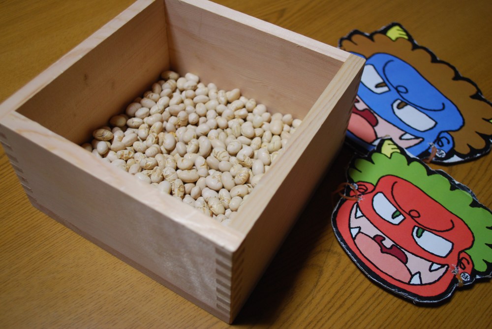 Dobrze, to o co chodzi z tą fasolą? W dawnej Japonii wierzono, że fasola (jap. mame) to wyjątkowe pożywienie, które nie tylko pozwala ludziom przetrwać zapewniając pożywne posiłki, ale też posiada moc odpędzania demonów. Pierwsza przypisywana fasoli cecha jest zrozumiała, co natomiast z drugą? Podobnie jak w przypadku szczęśliwych posiłków na chińskim stole noworocznym, o czym pisaliśmy TUTAJ, chodzi o podobieństwo brzmienia dwóch różnych wyrazów: mame jako fasola, oraz mame jako oczy demona. Słowa te zapisuje się innymi znakami, sposób ich wypowiadania jest jednak podobny. Mamemaki, czyli dosłownie rozrzucanie fasoli, polega na wyrzucaniu prażonych ziaren soi (jap. przez frontowe drzwi domu lub obrzucanie nimi osoby noszącej maskę demona. Tę drugą opcję najczęściej wybierają rodziny z dziećmi – wiadomo przecież: nie ma to jak obrzucić potwora fasolą, gdy ma się kilka lat.