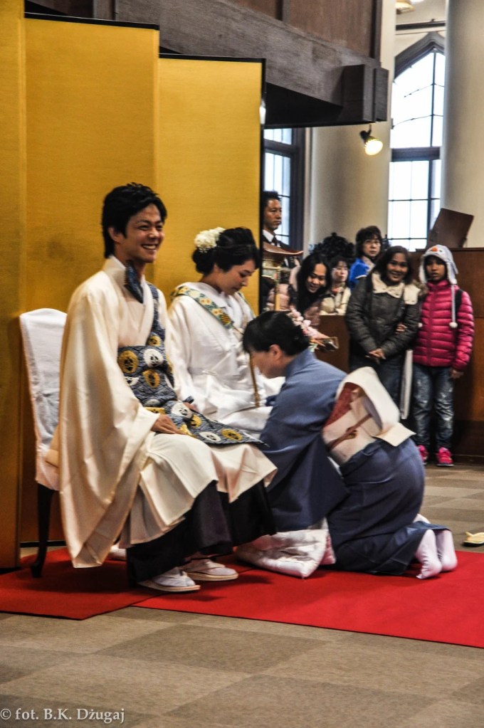 Co decyduje o wyborze ślubnego obrządku jeśli niekoniecznie względy religijne? Gust państwa młodych – wiele Japonek marzy o założeniu kreacji w stylu europejskiej księżniczki – lub budżet. Najtańsza jest, rzecz jasna, ceremonia świecka, trudno się więc dziwić, że stale zyskuje na popularności. Ślub ślubem, nie należy jednak zapominać o weselu. Zazwyczaj w przyjęciu uczestniczą już nie tylko członkowie najbliższej rodziny małżonków, ale także ich przyjaciele, nauczyciele i szefowie. Goście zobligowani są do podarowania nowożeńcom – shūgi, czyli prezentu w postaci gotówki. W przeciwieństwie do polskich weselników nie opuszczają przyjęcia z pustymi rękami, tuż po zajęciu swojego miejsca przy stole znajdują przy nim bowiem drobny upominek. W ten sposób młoda para dziękuję gościom za dzielenie z nimi tej wyjątkowej chwili.