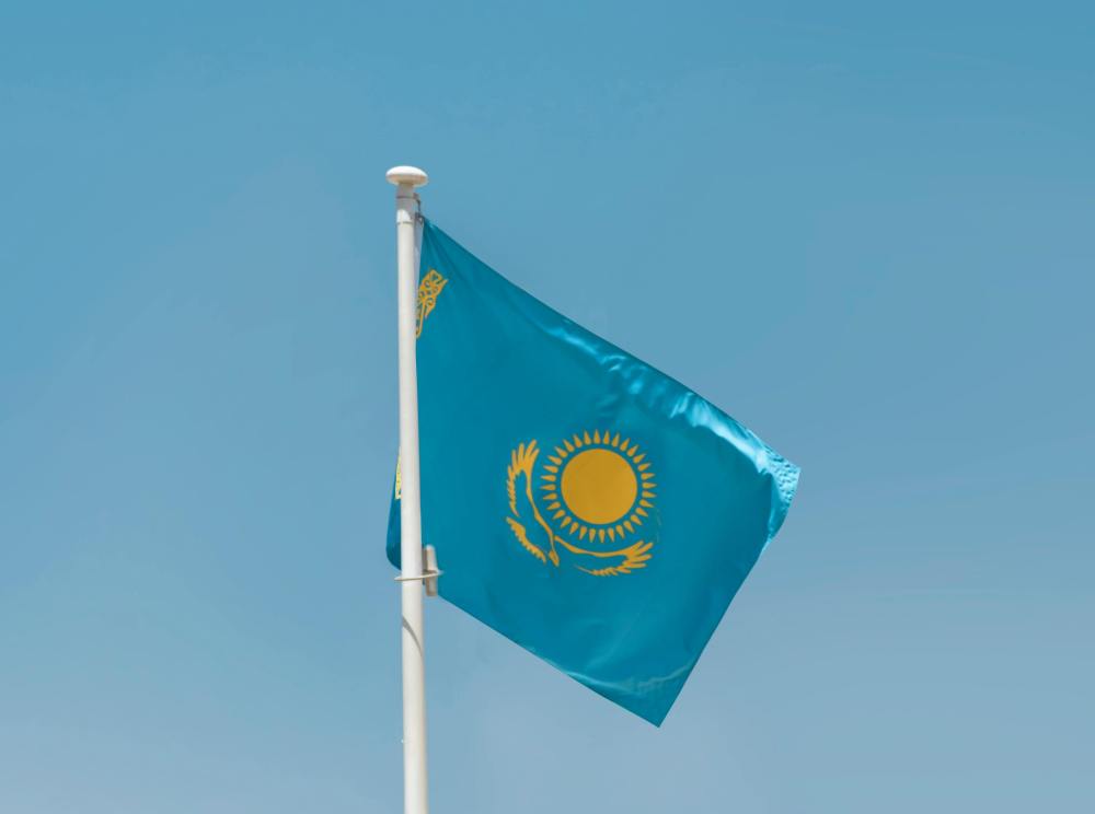 Flaga została przyjęta w 1992 roku, po uzyskaniu niepodległości od ZSRR. Niebieski symbolizuje pokój, czystość i nieskończone niebo nad stepami. Słońce i orzeł symbolizują wolność, rozwój oraz przyszłość narodu, natomiast regionalny wzór przy krawędzi przypomina o bogatym dziedzictwie kulturowym Kazachstanu.